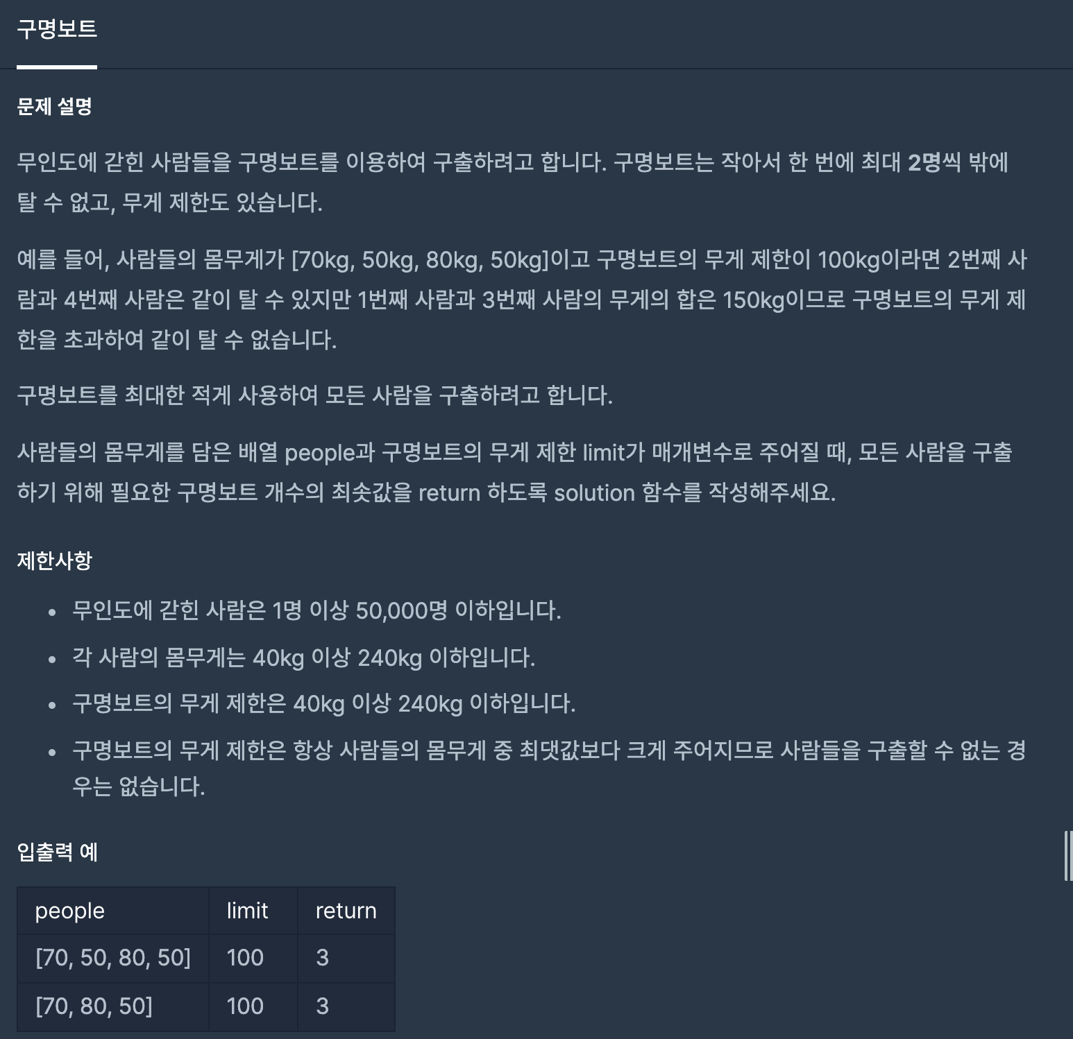 1. 구명보트는 한 번에 최대 2명씩 탈 수 있고, 무게 제한도 있습니다.