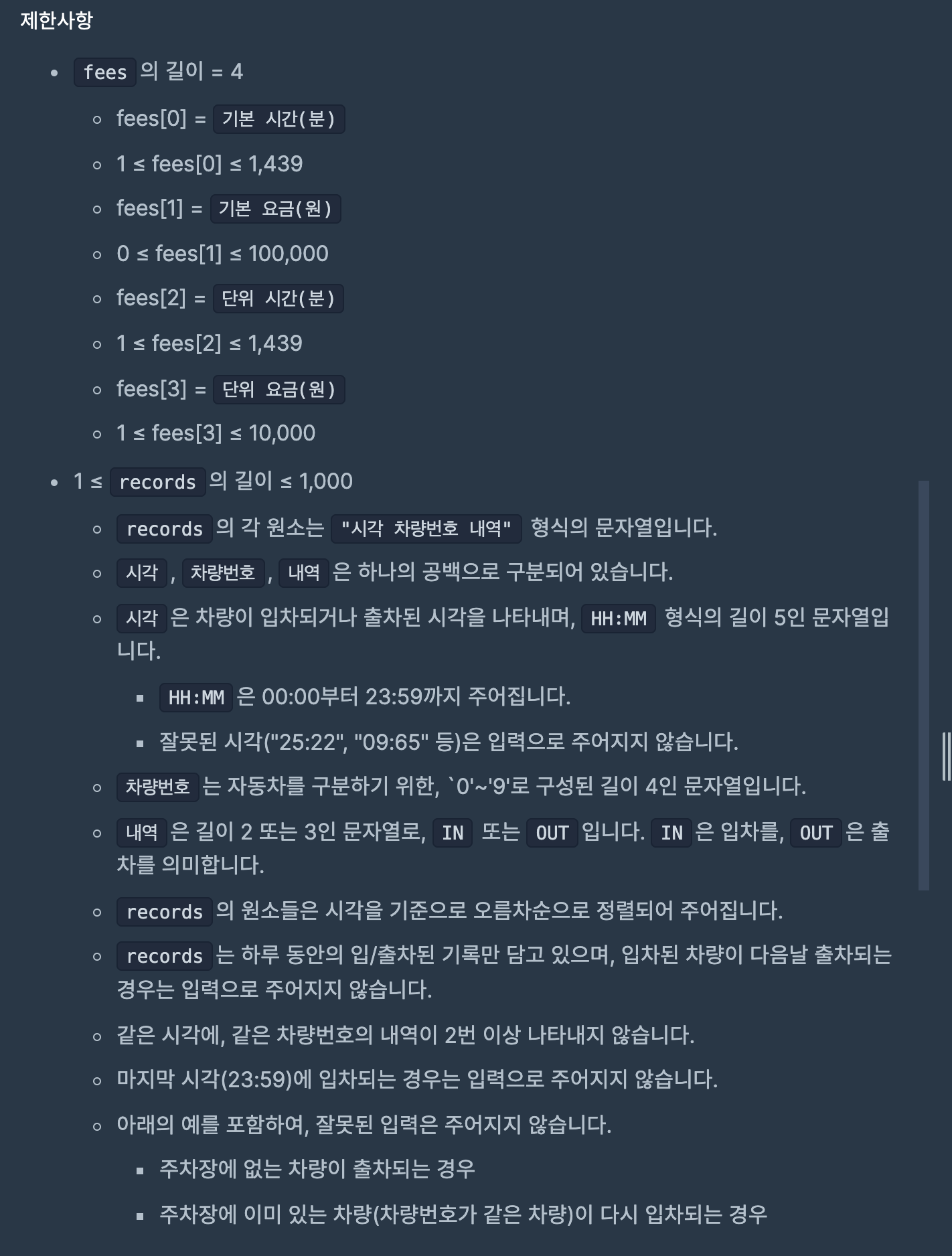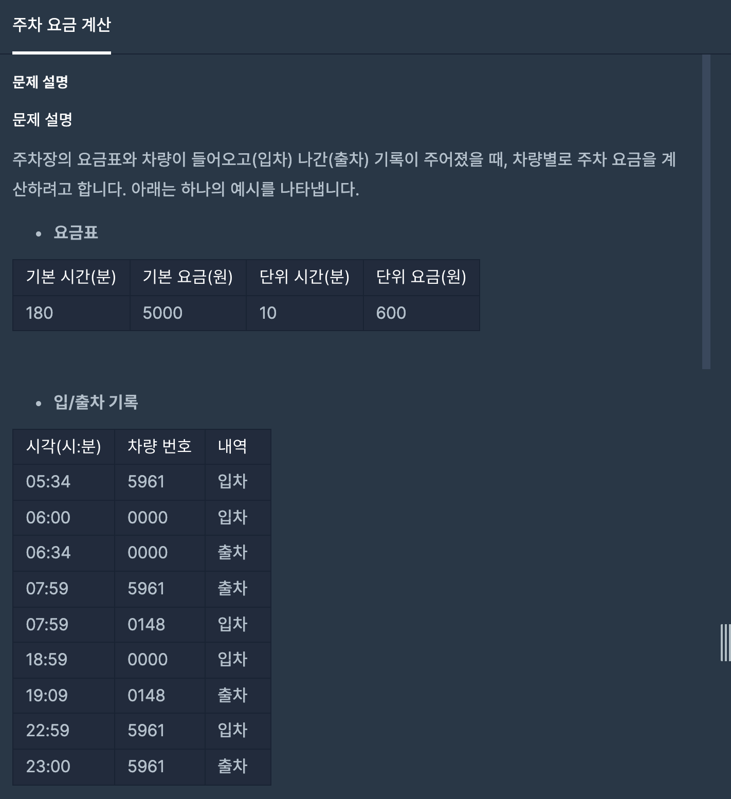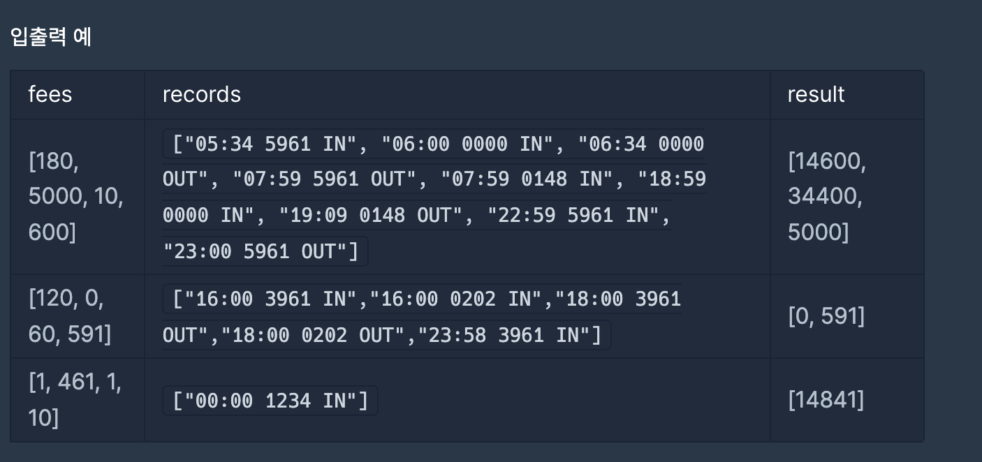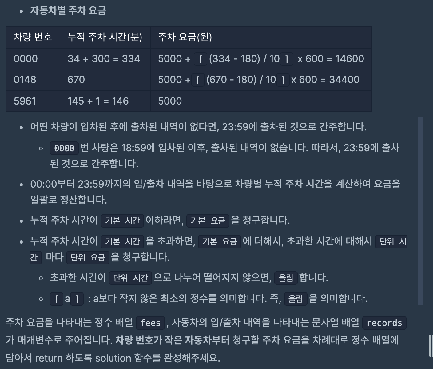2. 주의해야하는 점은 출차를 하지 않을 경우는 23시 59분에 출차한 것으로 가정한다는 것이다.