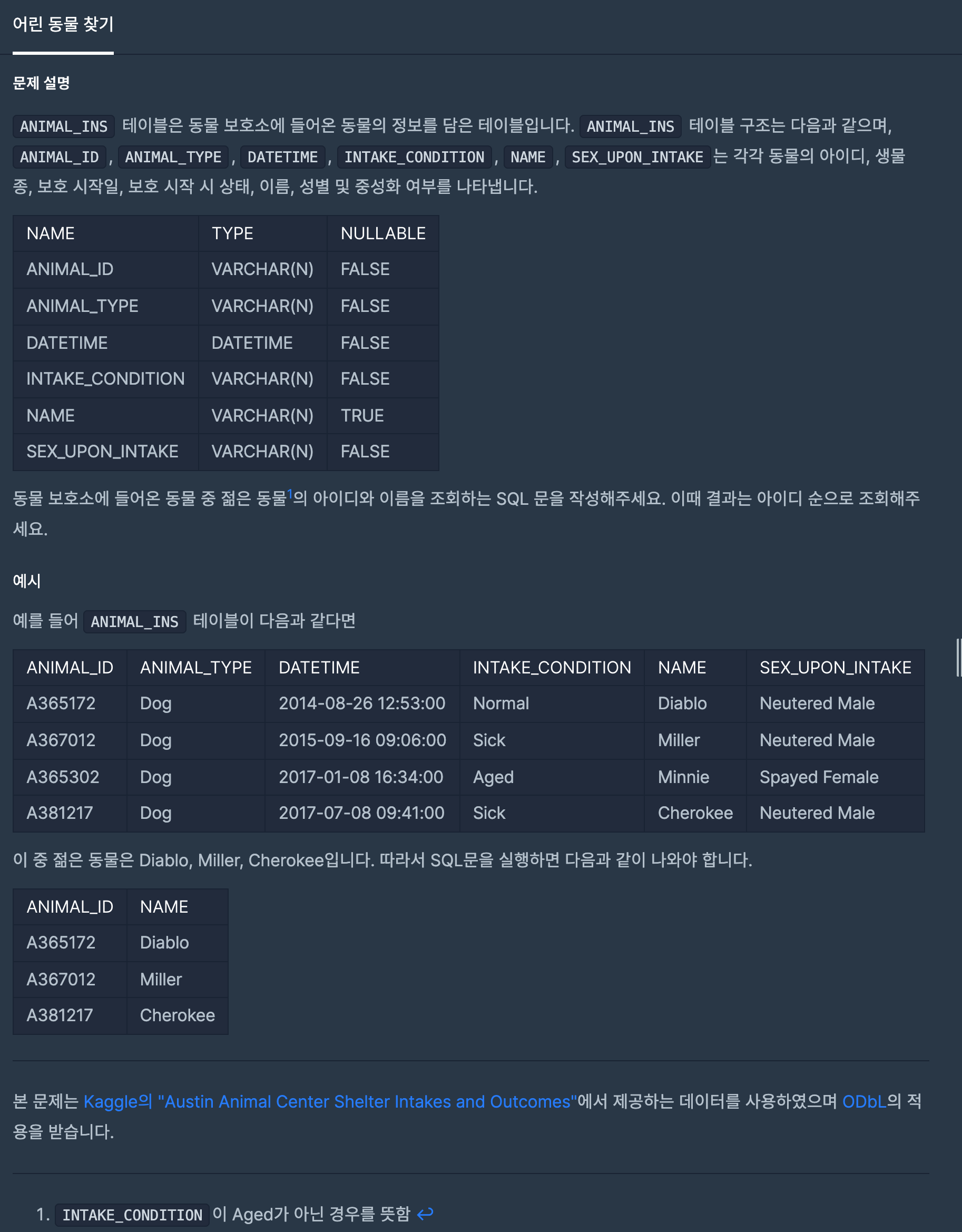 젊은 동물은 INTAKE_CONDITION 칼럼이 'Aged'이 아닌 경우를 의미합니다.