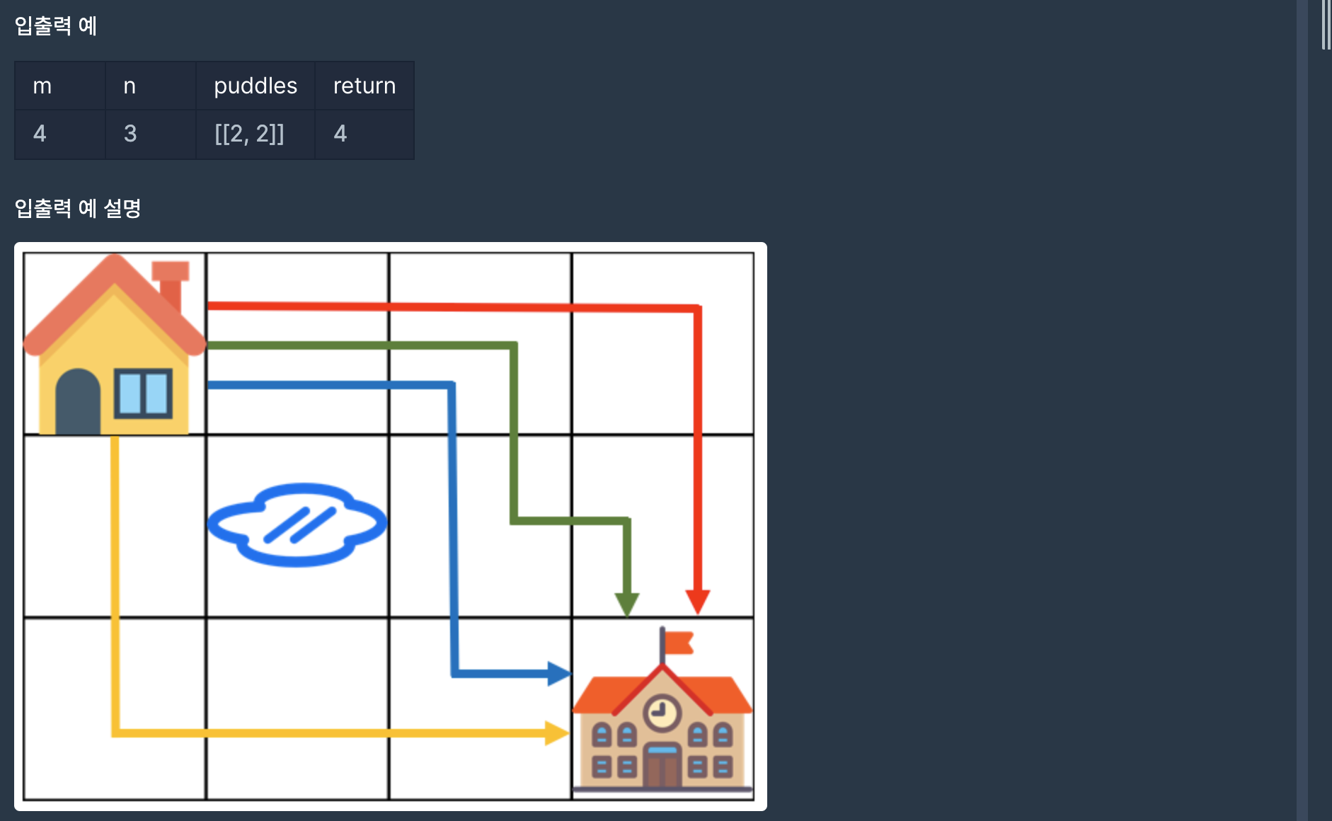 1. 물에 잠기지 않은 지역을 통해 학교로 가려고 합니다. 단, 오른쪽과 아래쪽으로만 움직일 수 있습니다.