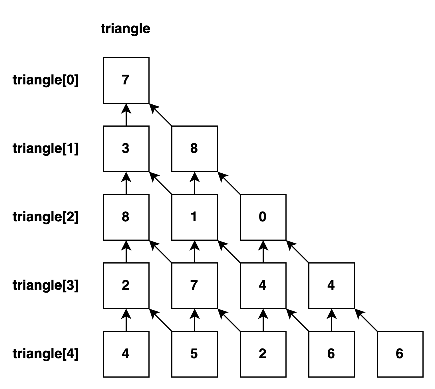 각 칸의 값은 양수이므로 아래 방향으로 내려가면서 거쳐간 숫자의 합은 증가하게 되고, 가장 마지막 줄에서 가장 큰 수가 삼각형의 꼭대기에서 바닥까지 이어지는 경로 중 거쳐간 숫자의 최댓값입니다.