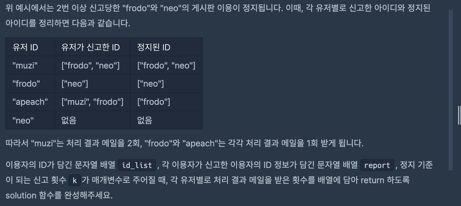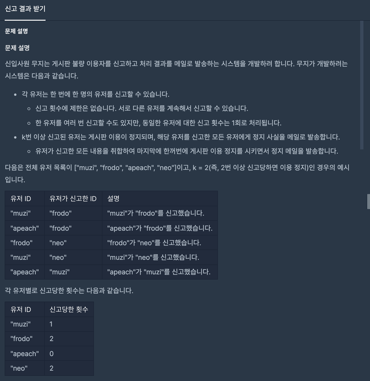 3. k번 이상 신고된 유저에 대해서는 해당 유저를 신고한 모든 유저에게 정지 사실을 메일로 발송합니다.