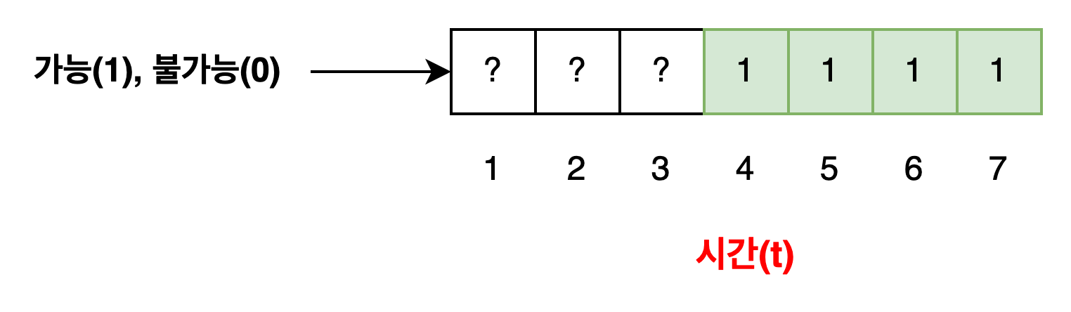 2. 여기서 중요한 점은 시간 t에 모든 사람이 심사를 받을 수 있다면 t 보다 큰 시간에도 자명하게 모든 사람이 심사를 받을 수 있습니다. 이러한 특성이 이분 탐색에서 빛을 발하게 됩니다. 그림을 통해 살펴보도록 하겠습니다.