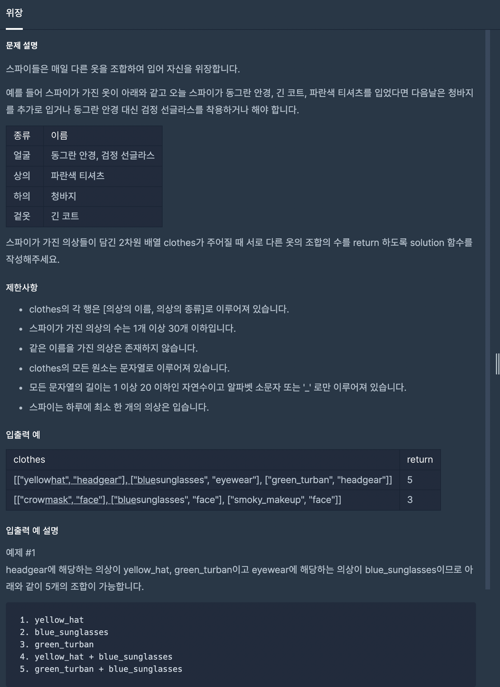 1. 스파이가 가진 의상으로 입을 수 있는 서로 다른 옷의 조합의 수를 반환하라.