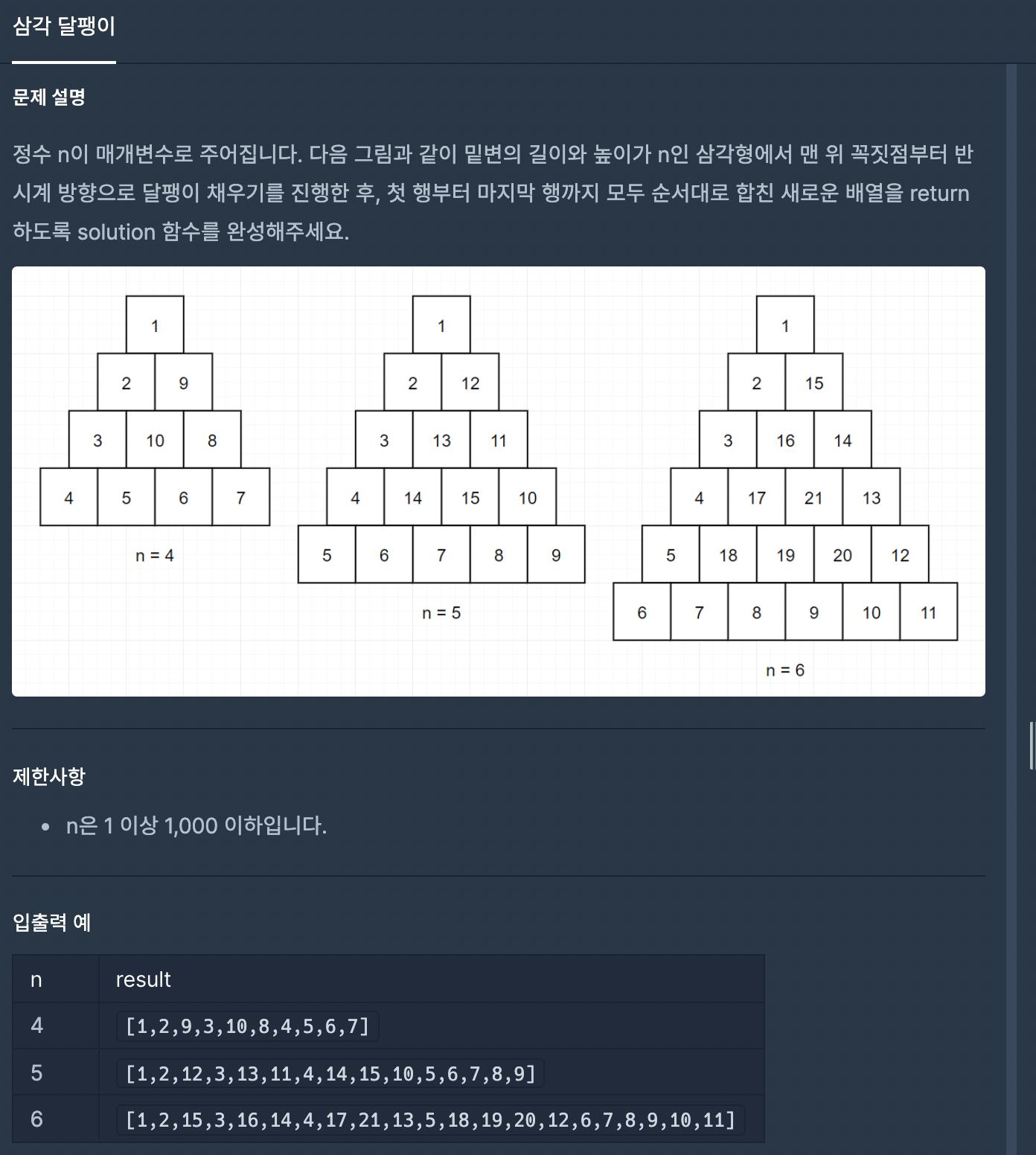 1. 밑변의 길이와 높이가 n인 삼각형에서 맨 위 꼭짓점부터 반시계 방향으로 달팽이 채우기를 진행한 후, 첫 행부터 마지막 행까지 모두 순서대로 합친 새로운 배열을 반환하라.