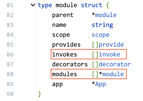fx.Module Option 내에 정의한 fx.Invoke , fx.Provide , fx.Module 는 fx.module 구조체로 관리되어지며, 모두 Slice 자료 구조로 관리되어짐을 알 수 있습니다.