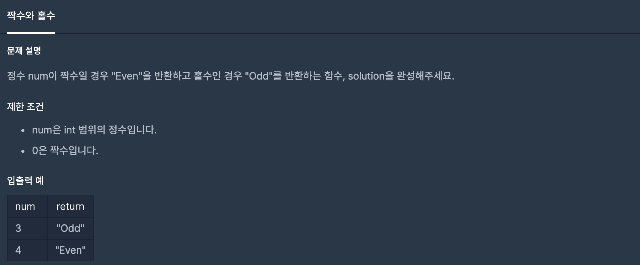 1. 정수가 짝수이면 "Even", 홀수이면 "Odd"를 반환한다.