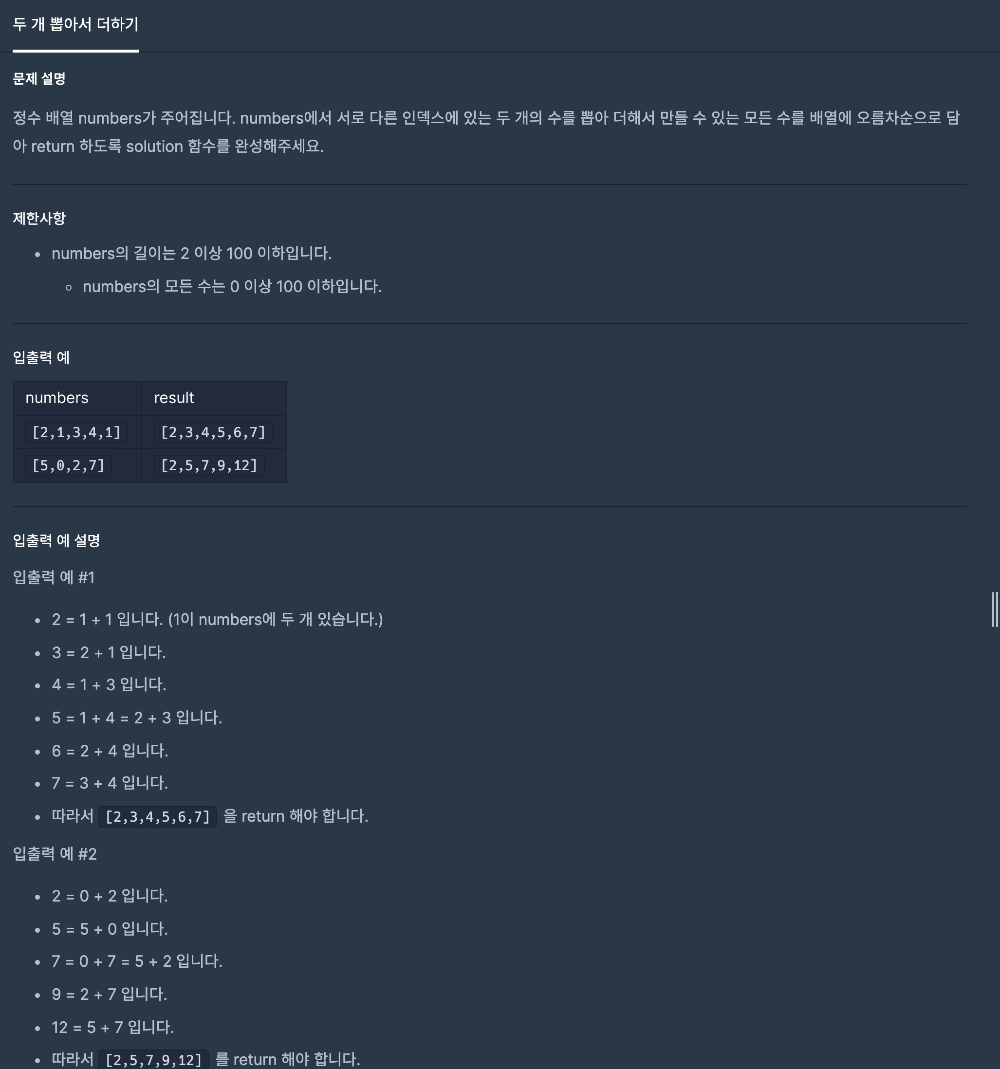 1. 정수 배열 numbers에서 서로 다른 인덱스에 있는 두 개의 수를 뽑아 더해서 만들 수 있는 모든 수를 구한다.