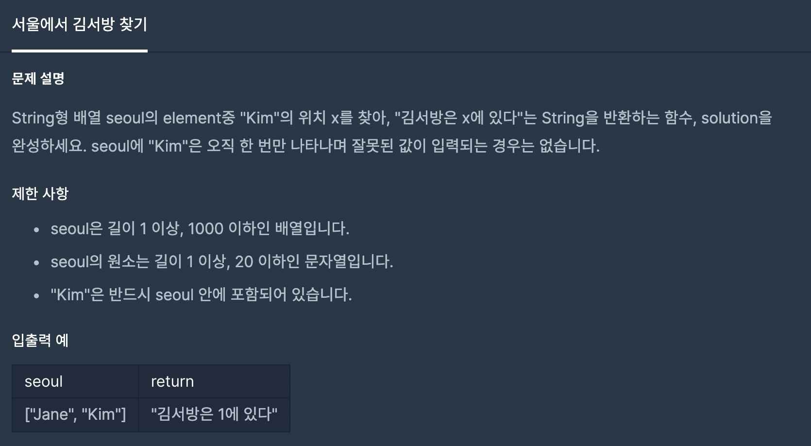 1. 문자열 배열에서 "Kim"의 위치를 찾아서 "김서방은 %d에 있다"의 포맷에 맞게 문자열로 반환하라.