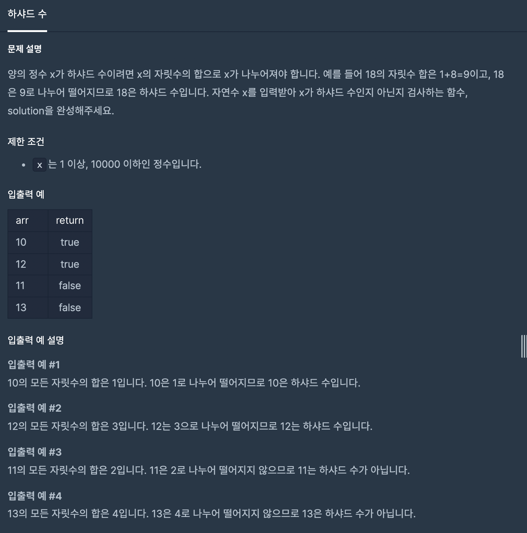 2. 주어진 정수가 하샤드 수라면 true, 아니라면 false를 반환하라.