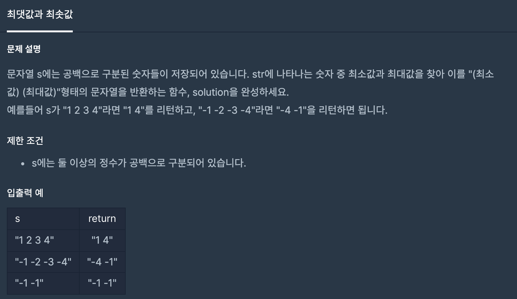 1. 공백으로 구분된 숫자들 중 최솟값과 최댓값을 "최솟값 최댓값"의 형태의 문자열로 반환하라.