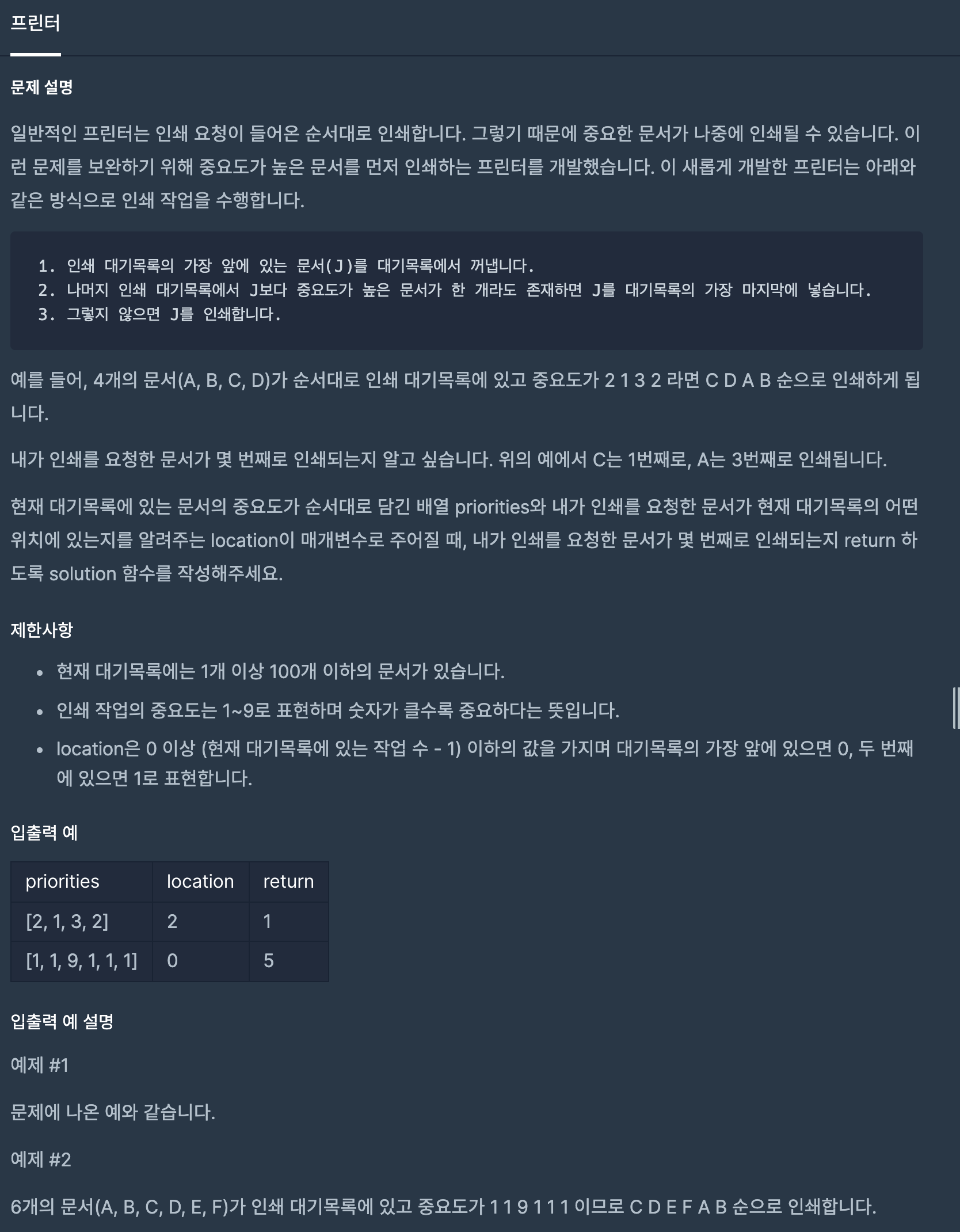 3. 위의 방식대로 출력할 때 내가 인쇄를 요청한 문서(위치 : location)가 몇 번째로 인쇄되는지를 반환하라.