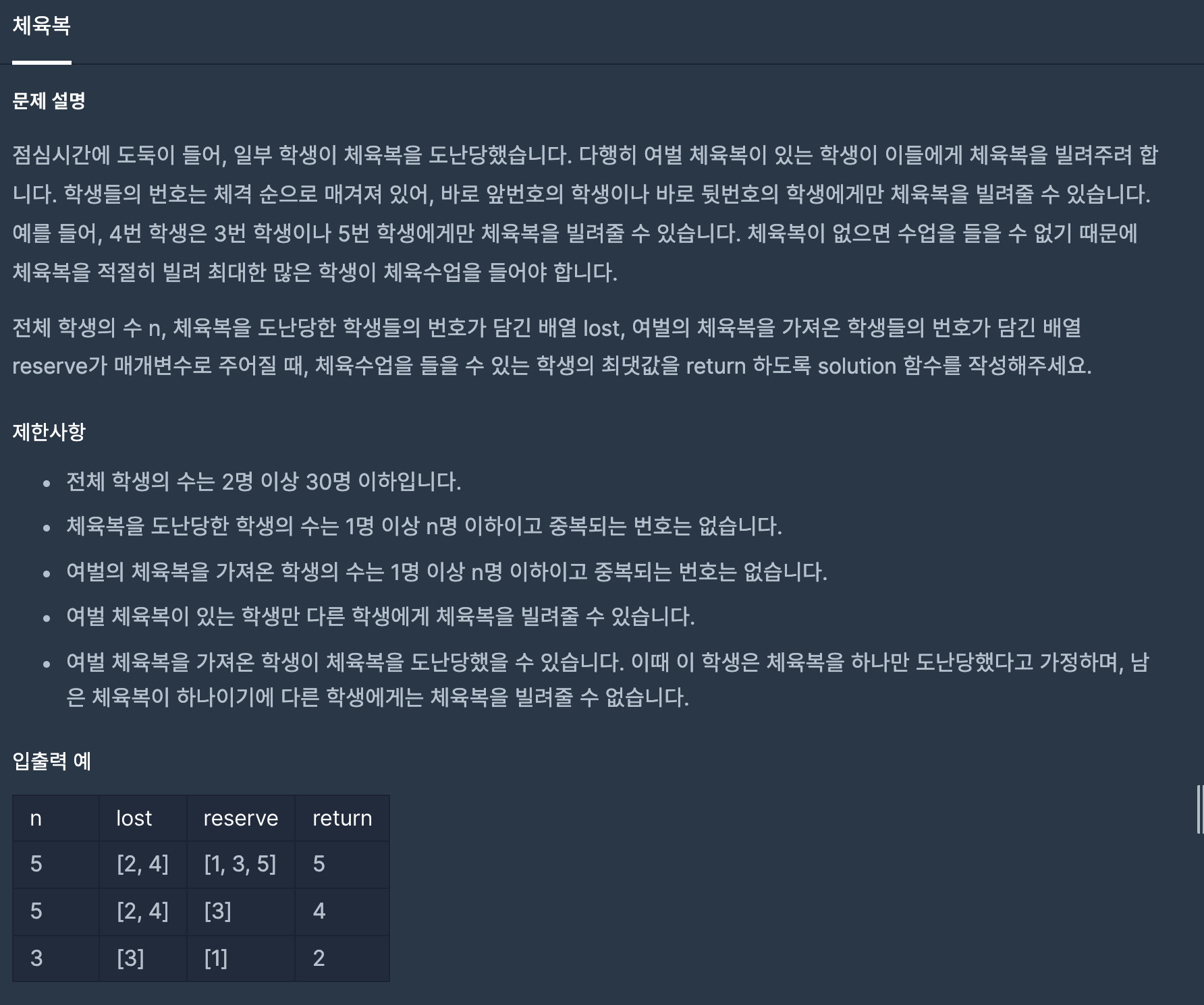 2. 여벌 체육복이 있는 학생만 다른 학생에게 체육복을 빌려줄 수 있습니다.